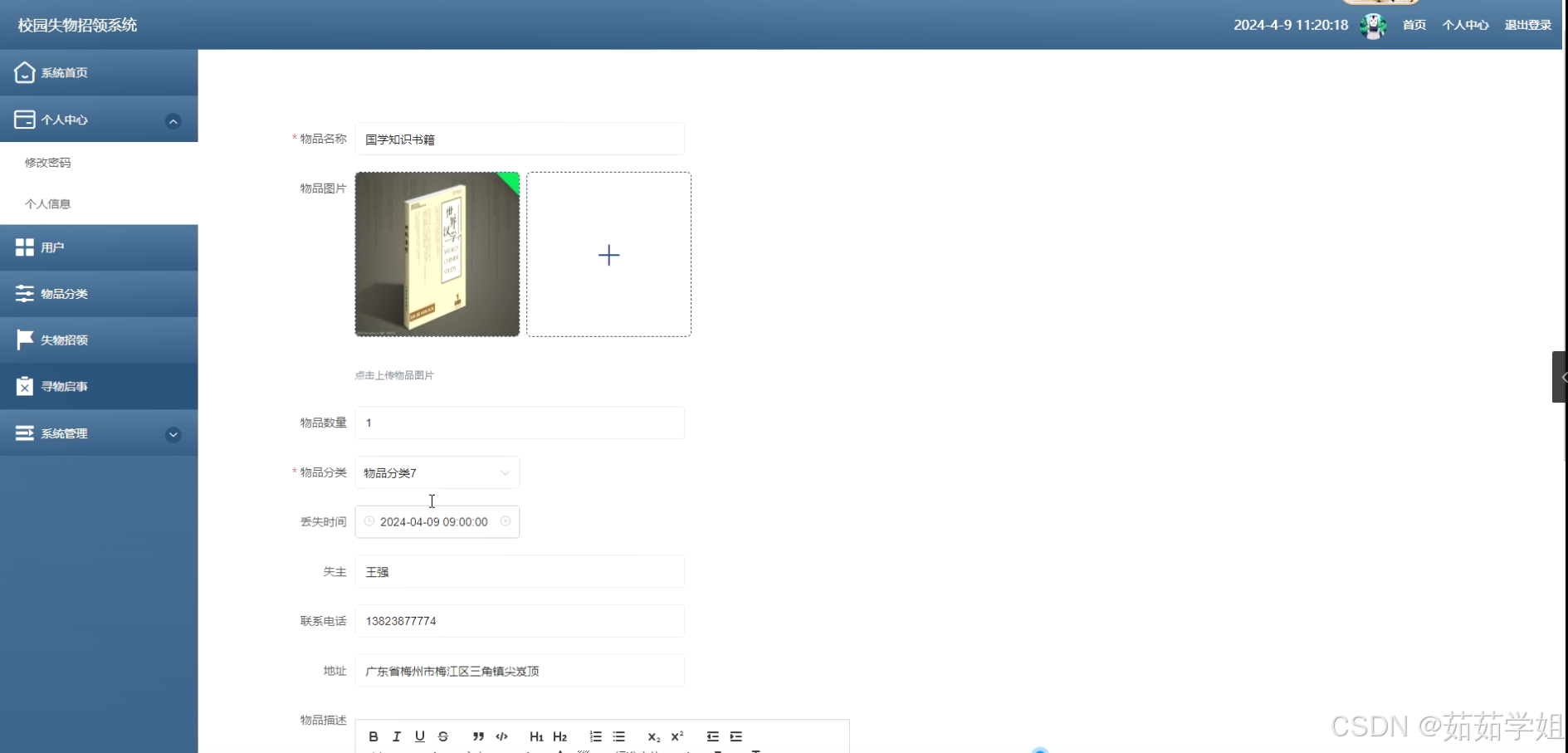 - 失主可以在系统中详细填写寻物启事,包括失物名称、特征(颜色、品牌、型号等)、丢失时间、丢失地点等关键信息,并上传失物的照片(如果有)。拾物者发布失物招领信息时也需要填写类似的详细信息,以便失主能够准确识别。