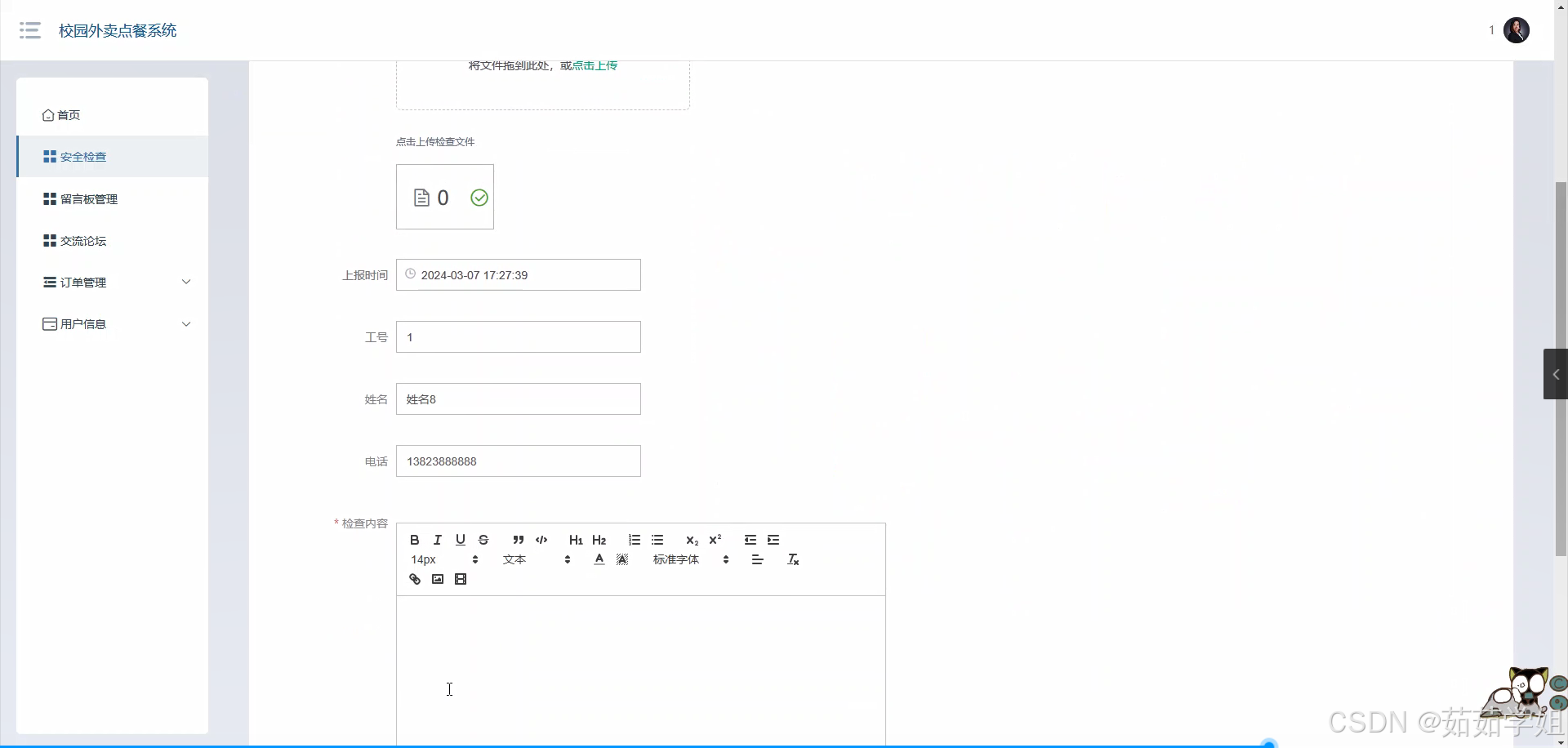 - 规范校园餐饮秩序:通过系统中的安全检查等功能,规范校园内的餐饮商家经营行为和外卖配送秩序,保障食品安全和配送安全,促进校园餐饮市场的健康发展。