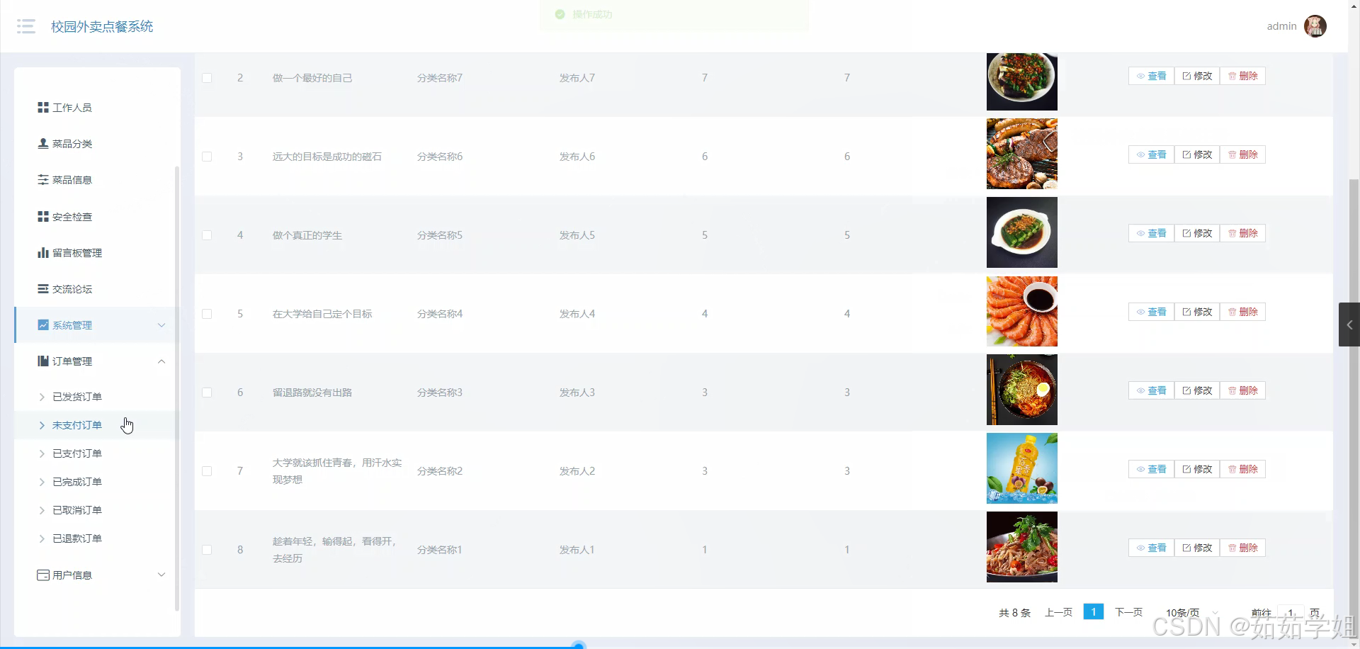 - 系统成果:成功开发出一个功能完整、运行稳定的校园外卖点餐系统,该系统具备用户、菜品分类、菜品信息、商家、工作人员、安全检查等完善的功能模块,能够满足校园内餐饮消费的各种需求。