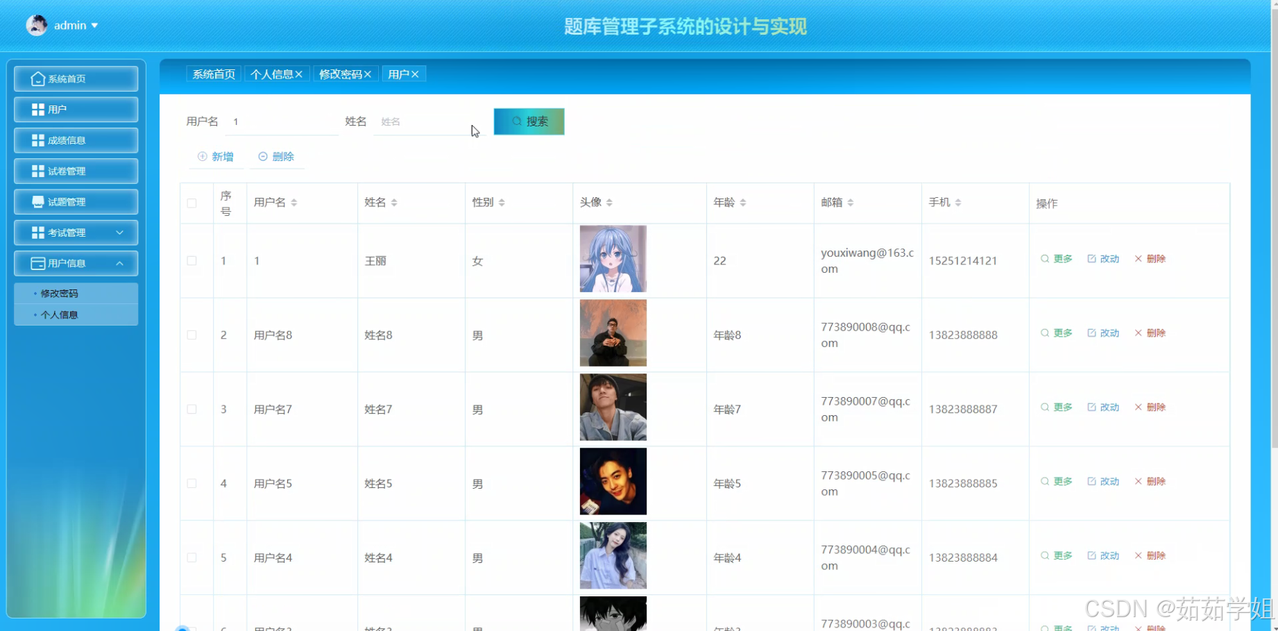 - 系统将用户分为教师、管理员等不同类型。教师主要负责试题的管理(包括添加、修改、删除试题等)、组卷以及成绩管理等操作。管理员则拥有更高的权限,如系统维护、用户信息管理等。不同类型的用户具有不同的操作权限,这是为了确保系统的安全性和数据的完整性。例如,教师不能随意修改其他教师的试题,管理员可以对整个系统的用户信息进行管理。引用自[1]中提到的系统对不同用户的需求管理以及权限设置的重要性。