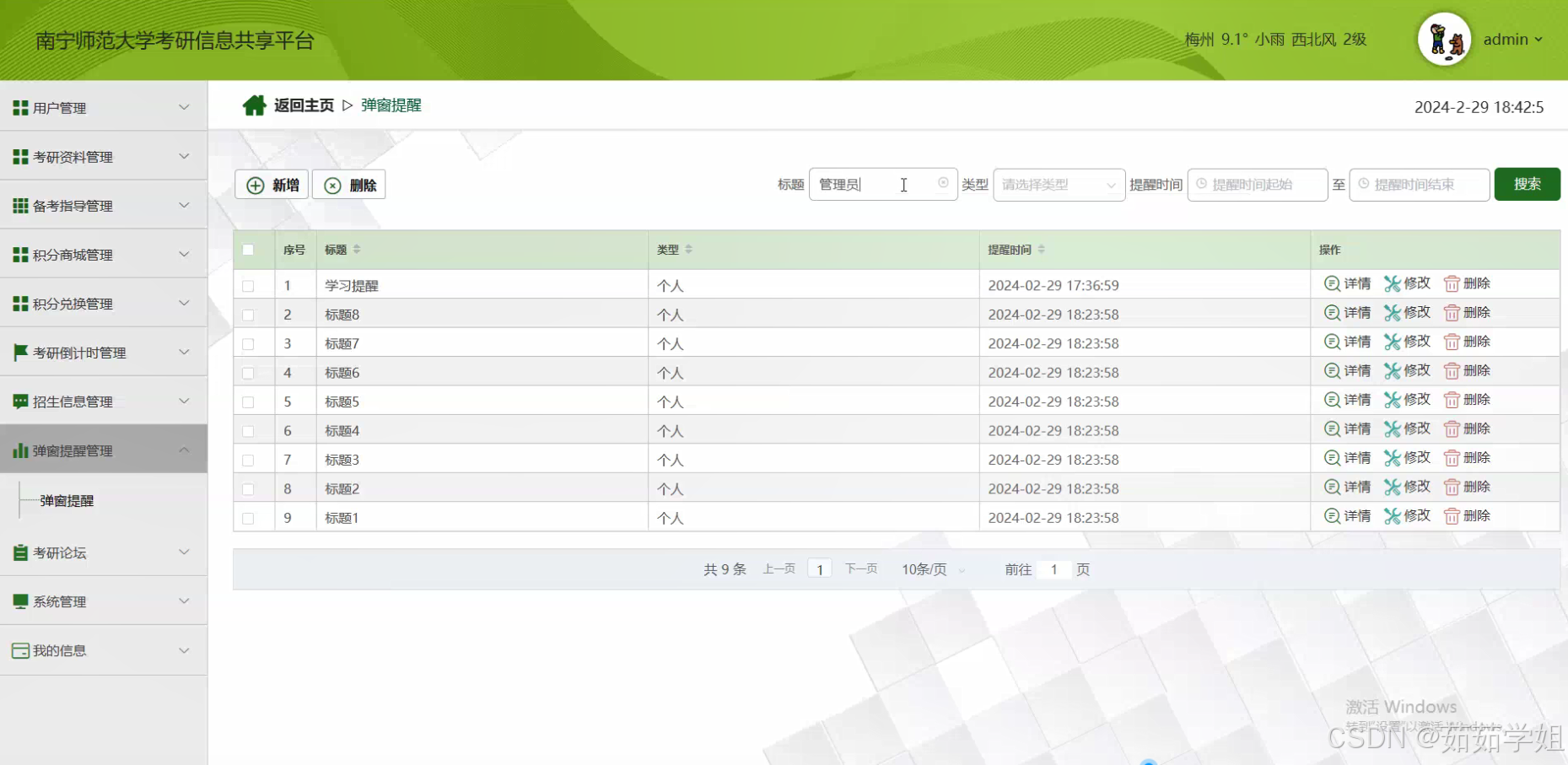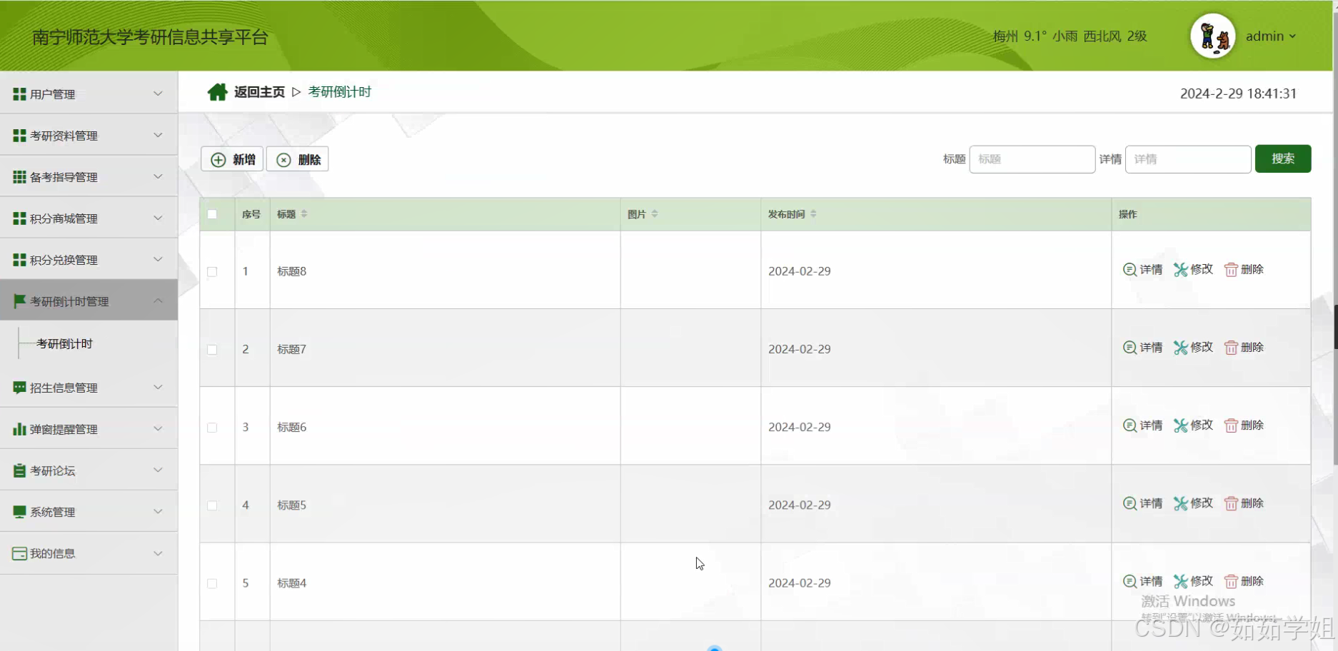 - 构建一个完善的南宁师范大学考研信息共享平台 该平台将整合南宁师范大学的考研相关信息,提供包括用户管理、考研资料、招生信息、备考指导、积分商城与积分兑换等功能,为考研学子提供全面、精准、及时的服务。