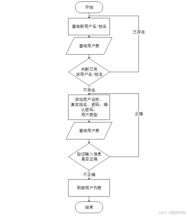 添加新用户的流程是先查询新用户名是否已存在,如已有该用户名,需重拟用户名并同时输入新用户的其它信息,添加新用户到数据库时会先验证数据是否完整,信息都正确且完整时,返回并刷新用户列表;信息不正确时,会返回输入信息的那一步。该流程如图3-4所示。