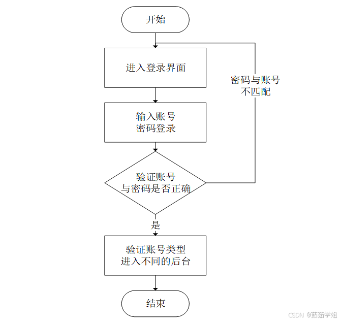 登录流程是该系统的第一个流程,登录的第一步是输入账号、密码登录,系统会验证账号与密码是否正确,正确时系统会判断账号类型再进入不同的后台;不正确时,会返回到登录的第一步,输入用户重新执行登录流程。该流程如图3-3所示。