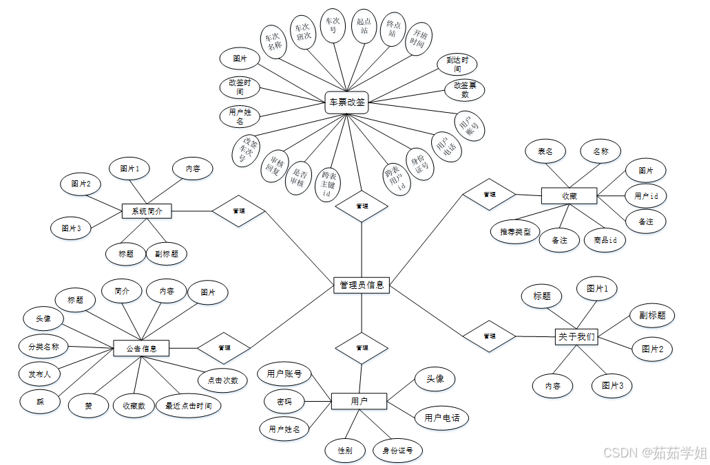 E-R图即实体-联系图,主要作用是提供了解显示数据类型存在的联系的途径,是藐视现实世界的概念模型,其关键要素是实体型、属性、联系。在系统中将对“用户、车票改签、公告信息、系统简介、关于我们、收藏”等作为实体,它们的局部E-R图,如图4-2所示: