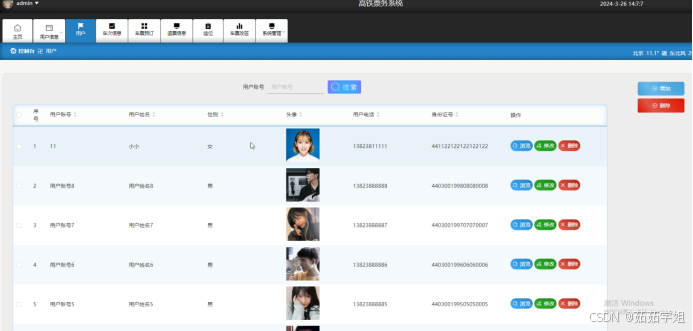 用户;在用户页面输入用户账号进行搜索、增加或删除用户列表,并对用户详细信息进行浏览、修改或删除操作;如图5-7所示: