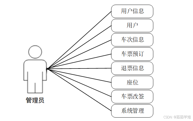 (1)管理员关键功能包含用户信息、用户、车次信息、车票预订、退票信息、座位、车票改签、系统管理等进行管理。管理员用例如下: