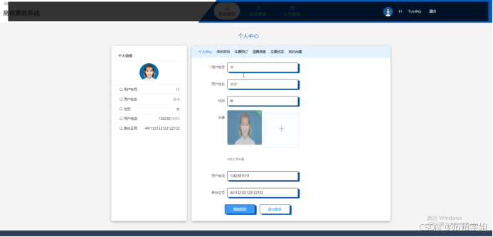 个人中心:在个人中心页面输入个人信息进行更新,并根据需要对个人中心、修改密码、车票预订、退票信息、车票改签、我的收藏进行操作,如图5-4所示: