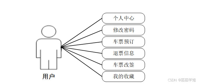 (2)用户关键功能包含个人中心、修改密码、车票预订、退票信息、车票改签、我的收藏等进行管理。用户用例如下: