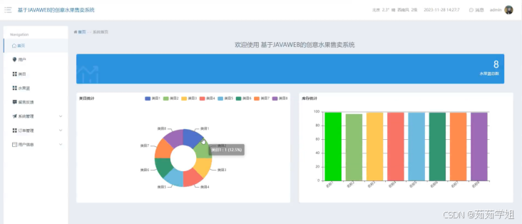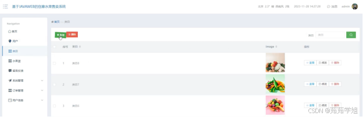 管理员进入主页面,主要包括对首页、用户、类目、水果篮、留言反馈、系统管理、订单管理、用户信息等进行操作。管理员主页面如图5-8所示: