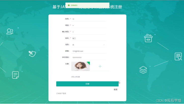 当用户进入系统进行相关操作前必须进行注册、登录,点击用户注册,通过输入账号、密码、姓名、性别、邮箱、手机号码、头像等信息进行注册操作,用户注册界面如图5-1-1所示;用户注册成功后,输入相关账和密码,进行身份验证,验证成功后可登录到前台进行相关操作,用户登录页面如图5-1-2所示: