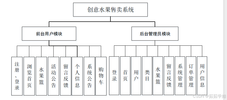 创意水果售卖系统按照权限的类型进行划分,分为用户和管理员两个模块。用户模块主要实现个人信息修改、对水果篮、活动公告、留言反馈、个人信息、系统公告、购物车等信息进行操作,增强了用户的操作体验。管理员模块主要针对整个系统的管理进行设计,提高了管理的效率和标准。系统的总体模块设计如下图所示: