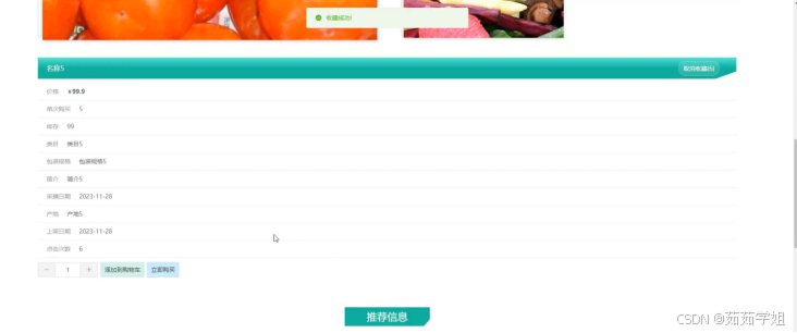 商品详情查看:用户可以查看水果的详细信息,包括图片、价格、产地、采摘日期等。
