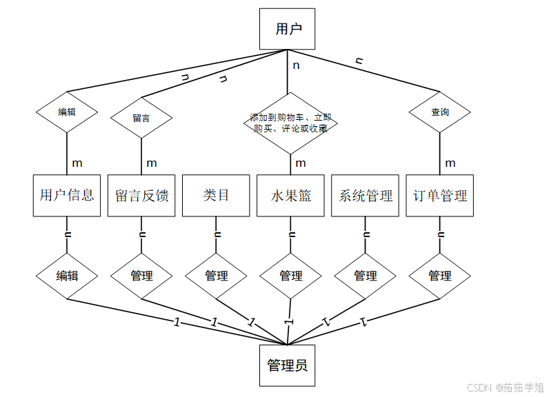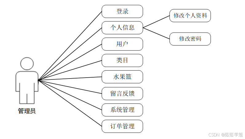 (2)、管理员的功能是最高的,可以对系统所有功能进行管理,包括对首页、用户、类目、水果篮、留言反馈、系统管理、订单管理、用户信息的管理。管理员用例如下: