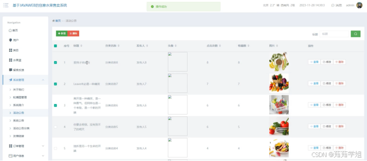 管理员点击系统管理,进入系统管理页面,点击活动公告,在活动公告页面输入标题可以查询相关信息,并进行新增、修改、删除等操作;管理员还可以对关于我们、轮播图、系统简介、系统公告、活动公告分类、友情链接等进行详细操作;活动公告管理界面如图5-12所示: