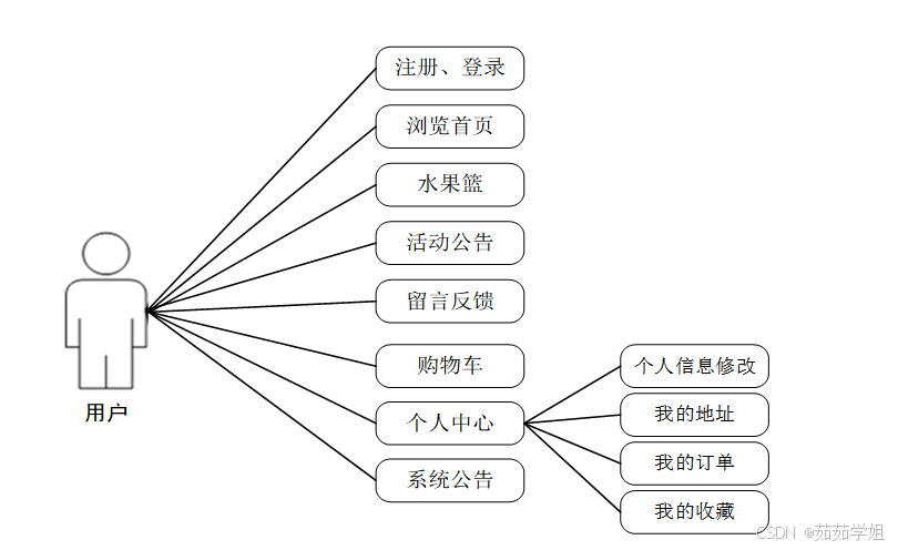 (1)、用户关键功能包含用户注册/登录,查看首页、水果篮、活动公告、留言反馈、个人信息、系统公告、购物车等有关信息,并进行详细操作。用户用例如下: