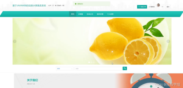 当用户打开系统的网址后,首先看到的就是首页界面。在这里,用户能够看到网站的导航条(首页、水果篮、活动公告、留言反馈、个人信息)、系统公告、购物车、轮播图和推荐信息等。系统首页界面如图5-2所示: