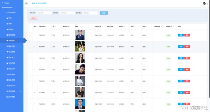 管理员点击老师预约。进入老师预约页面输入作品名称、老师姓名、是否通过可以搜索或批量删除老师预约信息,并进行查看和删除等操作。如图5-9所示: