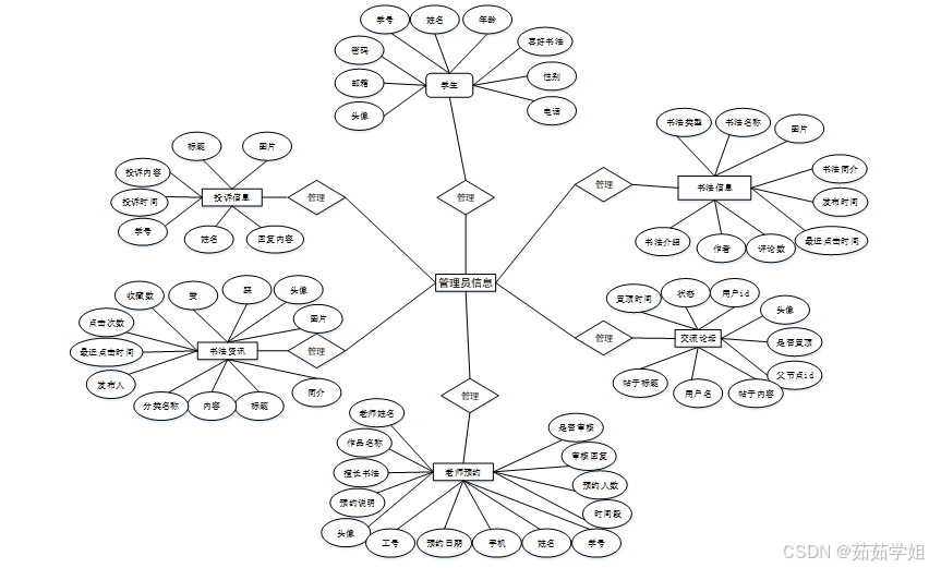 在一个资料模式中,一个被称作“实例”的实体,与真实的“事件”或者“物体”相匹配,可以与其它物体区分开来。例如,公司中的每个员工,家里中的每个家具。在系统中将对 “学生、老师预约、书法信息、交流论坛、书法资讯、投诉信息”等几个主要的实体属性进行布局,如图4-2所示: