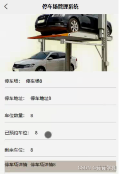 停车场:在停车场界面可以查看到停车场、停车地址、图片、车位数量、已预约车位、剩余车位、停车场详情等详细信息。停车场详情如图5-4所示。