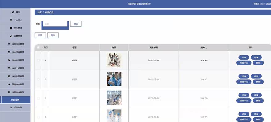 校园疫情管理,管理员可在校园疫情管理页面查看标题、封面、发布时间、发布