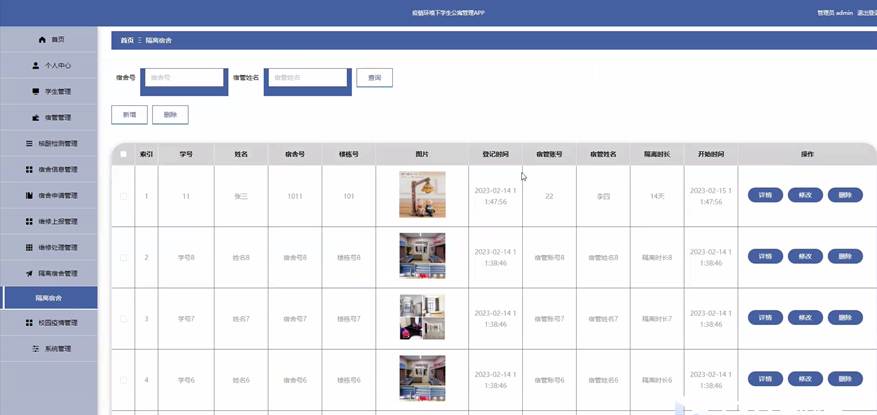 隔离宿舍管理,管理员可在隔离宿舍管理页面查看学号、姓名、宿舍号、楼栋号、图片、登记时间、宿管账号、宿管姓名、隔离时长、开始时间等内容,还可进行新增、修改或删除等操作,如图5-19所示。