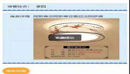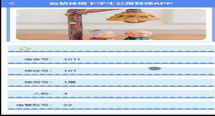 宿舍信息,学生可在宿舍信息页面查看宿舍号、图片、楼栋号、楼层号、人数、宿管账号、宿管姓名、宿舍详情等内容,还可进行收藏或宿舍申请等操作,如图5-6所示: