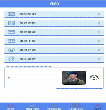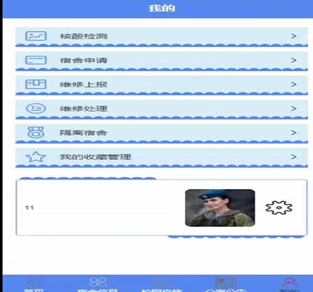 我的,学生可在我的页面查看用户信息、核酸检测、宿舍申请、维修上报、维修处理、隔离宿舍、我的收藏管理等内容,页面如图5-5所示: