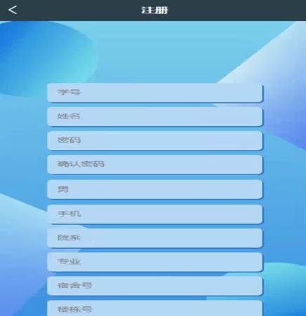学生注册,学生通过输入学号、密码、姓名、性别、手机、院系、专业、宿舍号、楼栋号等内容进行注册,如图5-2所示: