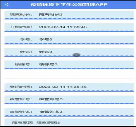 隔离宿舍,学生可在隔离宿舍页面查看隔离时长、开始时间、学号、姓名、楼栋号、登记时间、宿管账号、宿管姓名、隔离原因等内容,如图5-7所示。