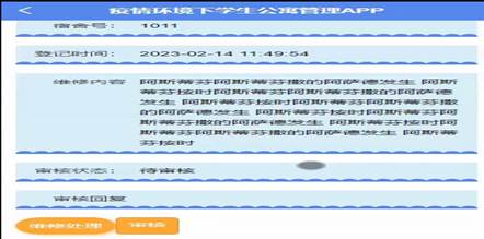 维修上报,宿管可在维修上报页面查看报修名称、封面、状态、报修单号、学号、姓名、手机、楼栋号、宿舍号、登记时间、维修内容、审核状态、审核回复等内容,还可进行审核或维修处理等操作,如图5-11所示: