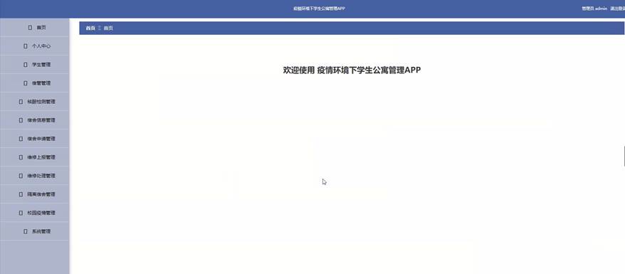 管理员通过登录进入系统可查看个人中心、学生管理、宿管管理、核酸检测管理、宿舍信息管理、宿舍申请管理、维修上报管理、维修处理管理、隔离宿舍管理、校园疫情管理、系统管理等内容,如图5-13所示: