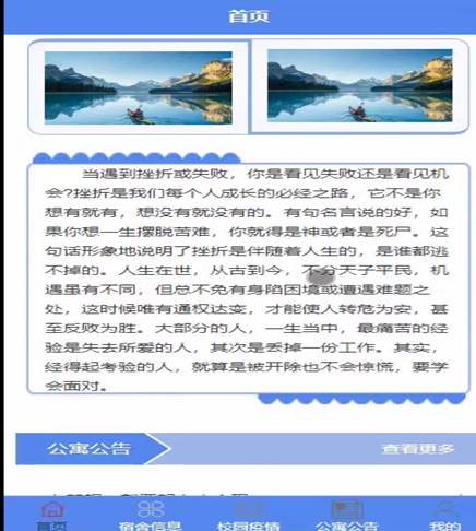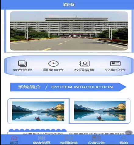 学生通过登录进入系统可查看首页、宿舍信息、隔离宿舍、校园疫情、公寓公告、我的等内容,如图5-4所示。