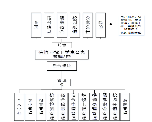 本课题要求实现优质的疫情环境下学生公寓管理APP,就一定要包含有数据库、服务器相联系,从而实现系统的功能运转。系统分为前端用户和后端管理员,前端用户包括学生和宿管,分别进行系统登录注册、个人信息和密码修改和对核酸检测、宿舍申请、维修上报、维修处理、隔离宿舍、我的收藏管理等功能进行操作;管理员包括登录、个人信息修改、学生管理、宿管管理、核酸检测管理、宿舍信息管理、宿舍申请管理、维修上报管理、维修处理管理、隔离宿舍管理、校园疫情管理、系统管理等功能。