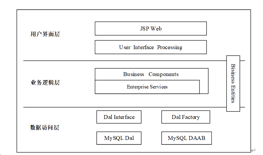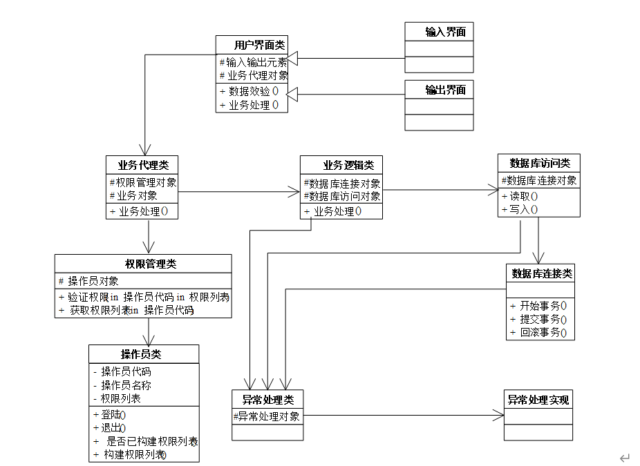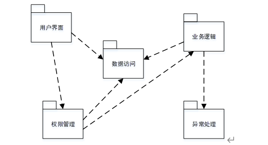 下面我们将根据架构设计原则和目标来建立系统的架构设计模型。将信息系统中对象分层,可分为三层:用户界面层、业务层、数据访问层(如下图4-2所示),再把各层中的一些公共部分提出来:权限管理、异常处理,这样得到包图如图4-3所示: