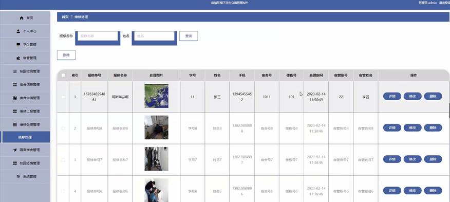 片、学号、姓名、手机、宿舍号、楼栋号、处理时间、宿管账号、宿管姓名等内容,还可进行修改或删除等操作,如图5-18所示。