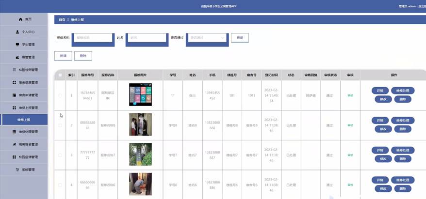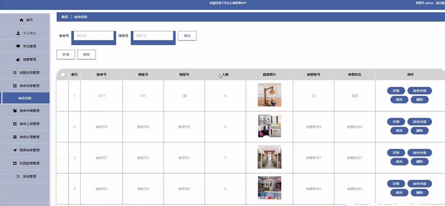 (3) 宿舍申请管理:管理员可以进行详情,修改,或删除等操作。