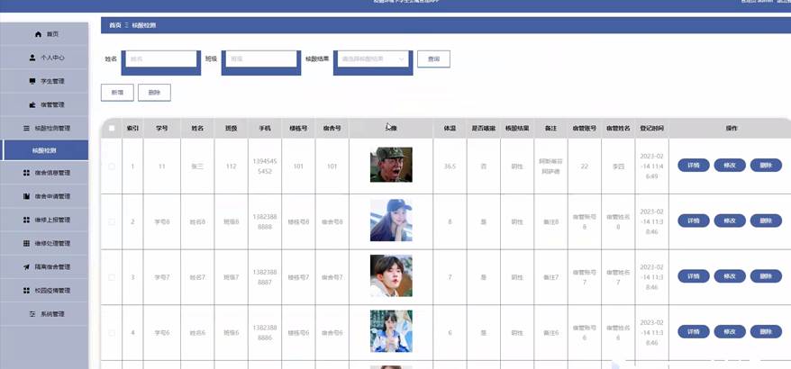 核酸检测管理,管理员可在核酸检测管理页面查看学号、姓名、班级、手机、楼栋号、宿舍号、头像、体温、是否咳嗽、核酸结果、备注、宿管账号、宿管姓名、登记时间等内容,还可进行新增、修改或删除等操作,如图5-15所示: