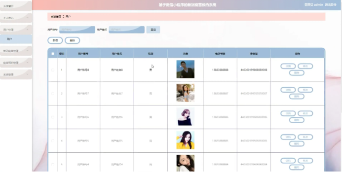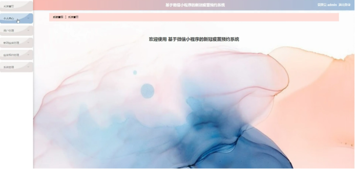 管理员进入主页面,主要功能包括对个人中心、用户管理、新冠疫苗管理、疫苗预约管理、系统管理等进行操作。管理员主页面如图5-7所示: