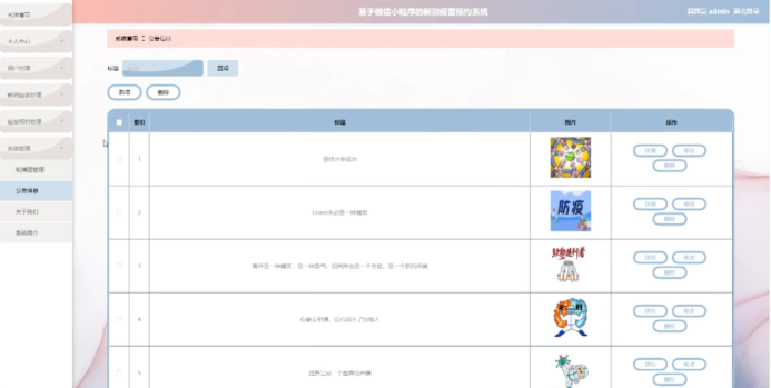 管理员点击系统管理。进入公告信息页面输入标题可以查询,新增或删除公告信息列表,并根据需要对公告详细信息进行查看详情,修改或删除等操作;还可以对轮播图管理、关于我们和系统简介进行详细操作。如图5-11所示: