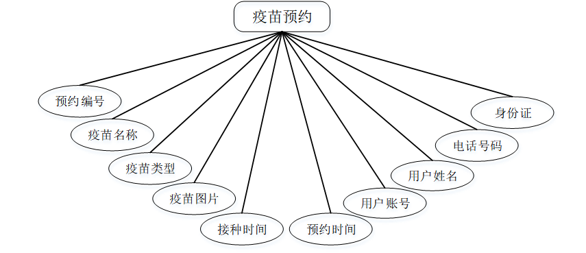 通过对新冠疫苗预约系统的主要功能信息进行规划并分为若干功能实体信息,实体信息将使用E-R图加以表示,本系统的主要功能实体图如下所示。