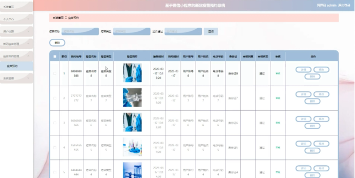 管理员点击疫苗预约管理。进入疫苗预约页面输入疫苗名称、疫苗类型和选择是否通过可以查询或删除疫苗预约列表,并根据需要对疫苗预约详细信息进行查看详情,修改或删除等操作。如图5-10所示: