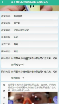 新冠疫苗:在新冠疫苗界面可以看到疫苗名称、疫苗类型、疫苗编号、图片、适用年龄、生产厂家、接种地址、接种须知、预约流程、疫苗介绍等详情,按照提示即可进行预约操作。新冠疫苗详情如图5-4所示。