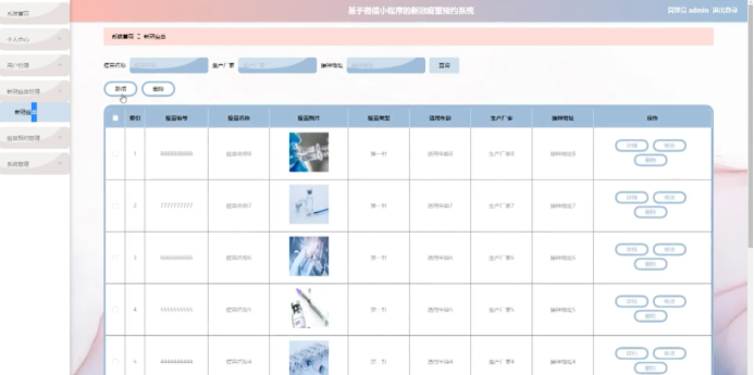 管理员点击新冠疫苗管理。进入新冠疫苗页面输入疫苗名称、生产厂家和接种地址可以查询,新增或删除新冠疫苗列表,并根据需要对新冠疫苗详细信息进行查看详情,修改或删除等操作。如图5-9所示: