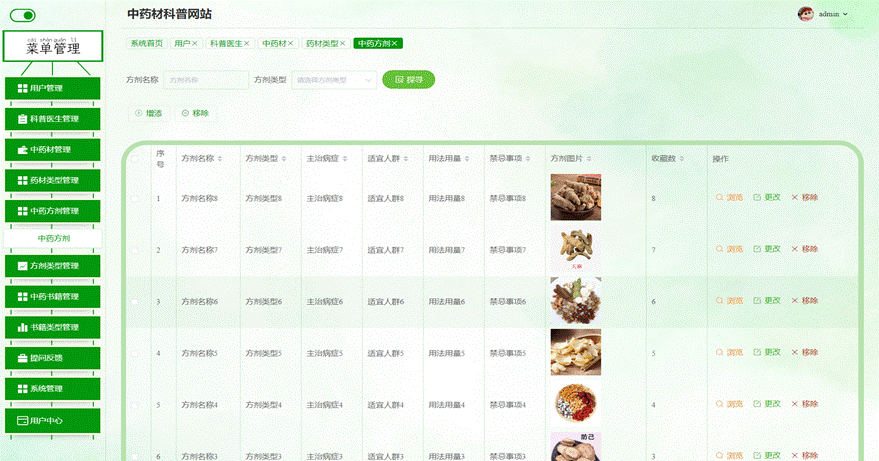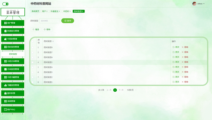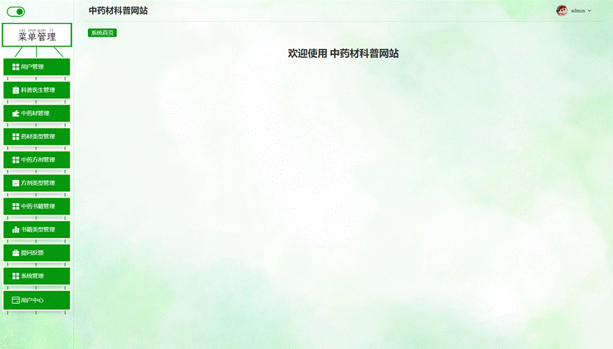 管理员进入主页面,主要功能包括对用户管理、科普医生管理、中药材管理、药材类型管理、中药方剂管理、方剂类型管理、中药书籍管理、书籍类型管理、提问反馈、系统管理、用户中心等进行操作。管理员主页面如图5-7所示: