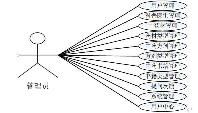 管理员模块:管理员是系统中的核心用户,管理员登录后,可以对后台系统进行管理。主要功能有用户管理、科普医生管理、中药材管理、药材类型管理、中药方剂管理、方剂类型管理、中药书籍管理、书籍类型管理、提问反馈、系统管理、用户中心等功能。管理员用例如图3-2所示。