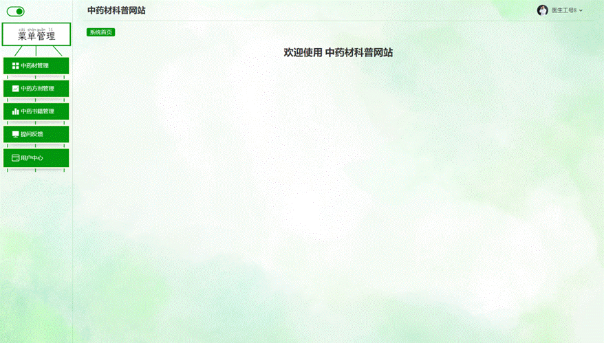 科普医生进入主页面,主要功能包括对中药材管理、中药方剂管理、中药书籍管理、提问反馈、用户中心等进行操作。科普医生主页面如图5-12所示: