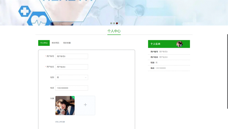 个人中心:在个人中心页面可以对修改密码、我的收藏等进行详细操作;如图5-5所示: