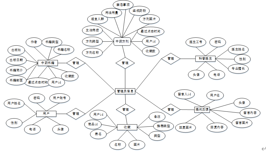 E-R图即实体-联系图,主要作用是提供了解显示数据类型存在的联系的途径,是藐视现实世界的概念模型,其关键要素是实体型、属性、联系。以下将本系统的“中药书籍、中药方剂、科普医生、提问反馈、收藏、用户”等作为实体,它们的局部E-R如图4-3所示: