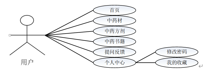 用户模块:用户登录后可以对首页、中药材、中药方剂、中药书籍、提问反馈、个人中心等功能进行操作。用户用例如图3-3所示。