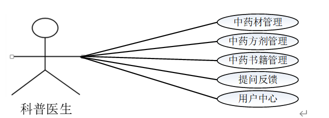 科普医生模块:科普医生登录后,可以对后台系统进行管理。主要功能有中药材管理、中药方剂管理、中药书籍管理、提问反馈、用户中心等功能。科普医生用例如图3-4所示。